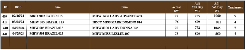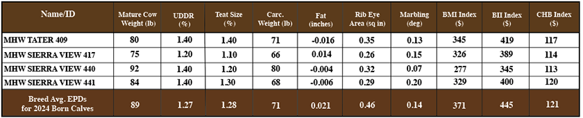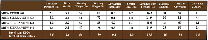 Thank you for your overwhelming response to our 2025 Sales Book. We currently have only four bulls for sale. Please contact Loren Mrnak if you are interested in one of our remaining bulls. Otherwise, we hope to see you at the Great Basin Bull Sale in Fallon on February 14, 2026. The first chart below has photos of our remaining bulls. Click on the photograph and you will be directed to a link to the American Hereford Association should you need additional data.Videos provided upon request. The second and third chart are The Expected Progeny Differences (EPDs) which were updated on September 1, 2025. Our final section provides information on Sire, Dam, Actual Birth Weight, Adjusted Weights and Tenderness.